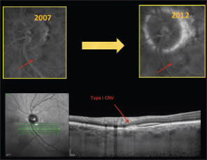 Dr. Freund continued, “If you look at eyes that develop PCV, it's probably not a coincidence that they are the same eyes that develop type 1 neovascularization.” Thus, polyps are seen not only with neovascular AMD, but also with peripheral exudative hemorrhagic chorioretinopathy, peripapillary CNV, within type 1 neovascular tissue arising overly choroidal nevi, and in cases of chronic central serous chorioretinopathy (CSC) which develop vascularized pigment epithelial detachments.
