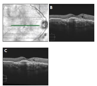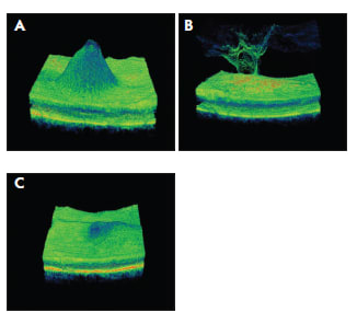 Figure 5. 3-D scans from the Topcon DRI OCTi-1 illustrate the depth of the 1050-nm wavelength: A) pigment epithelium detachment; B) vitreo-macular traction; C) DME.