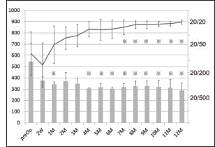 In this trial, patients receiving Eylea at an initial dose of 2 mg, followed by treatment on an as-needed basis, had a mean improvement in best-corrected visual acuity (BCVA) from baseline at week 24 of 12.1 letters, compared to a loss of 2.0 letters in patients receiving sham injections.
