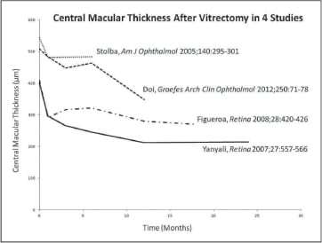Figure 3. Data from several reported series showed improvement in central macular thickness following vitrectomy.