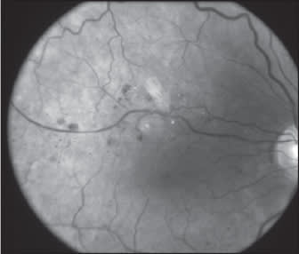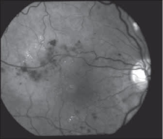 Figure 1. A preoperative photograph (left) shows nonproliferative DR with a large area of thickening in the superior macula. Six months after vitrectomy with ILM removal (right), the image shows resolution of the macular edema and significant regression of the DR.