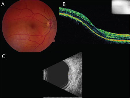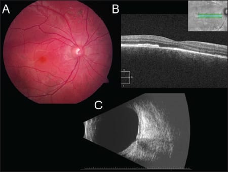 Figure 4. Two months after external beam radiotherapy that involved a total dose of 2000 cGy in 10 sessions, fundus photographs (A) and OCT (B) demonstrated resolution of the retinal detachment. Ultrasonography (C) revealed a thinning of the previously noted thickened choroid.