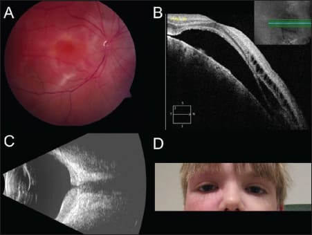 Figure 3. A 13-year-old boy with Sturge-Weber syndrome and a diffuse choroidal hemangioma of the right eye. The fundus image shows classic tomato-catsup appearance with extensive serous retinal detachment (A). OCT reveals subretinal fluid and edema in the outer retinal layers, suggestive of a chronic process (B). Ultrasonography confirms a diffusely thickened choroid with high internal reflectivity (C). A port wine stain is present on the ipsilateral side (D).