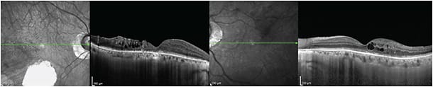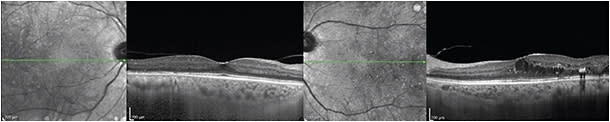 The choroid is thicker in CSR (Figure 1) than in normal eyes (414-478 µm vs 248 µm, respectively), and the choroidal vascular lumens appear enlarged.11 In chronic CSR, a “double layer sign” may appear, with an undulating RPE layer, hyporeflective middle layer, and intact Bruch’s membrane.11