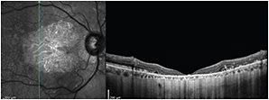 | Choroidal melanoma | - Highly reflective band in anterior choroid, choroidal shadowing, compresses choriocapillaris, shaggy photoreceptors