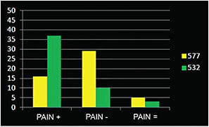 Figure 5. Percentages of patients experiencing more, less, or similar pain after the 577-nm and 532-nm laser sessions.