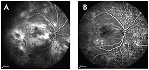 Figure 4. Proliferative diabetic retinopathy regression at the last follow-up visit: first visit angiogram (A) and last visit angiogram (B) with regression of the neovascularization.