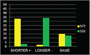 Figure 7. Percentages of patients considering the length of the laser session to be longer, shorter, or of similar duration to preceding sessions.