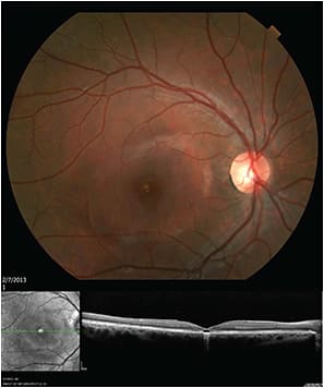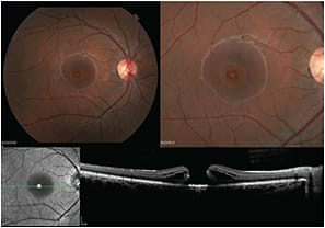 Figure 1. An 11-year-old boy presented with a traumatic macular hole after direct exposure to an Nd:YAG laser beam (1,060 nm). Visual acuity was 20/100. Fundus photograph reveals an irregularly shaped full-thickness macular hole with a small cuff of intraretinal fluid (top). Spectral-domain OCT confirmed these findings (bottom).
