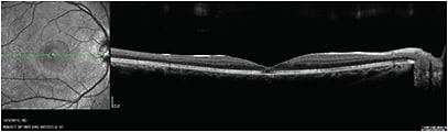 Figure 3. The same patient in Figures 1 and 2 at one year post-trauma and -surgical repair. SD-OCT shows closed macular hole; the outer retina appears to be remodeling. No fundus photo was available. The patient had final vision of 20/25.
