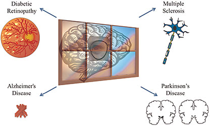 Figure 1. A drawing depicting how ocular changes in diabetic retinopathy, multiple sclerosis, Alzheimer’s disease, and Parkinson’s disease can all be used as a “window to the brain.”