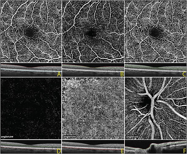 Figure 2. OCTA image, 3 mm x 3 mm, of a normal eye. Full thickness OCT angiogram and corresponding OCT B scan of the internal limiting membrane to Bruch’s membrane (A). OCTA of the inner retina (B), middle retina (C), outer retina (D), and choriocapillaris (E). OCTA at the optic nerve showing the radial peripapillary vascular network (F).