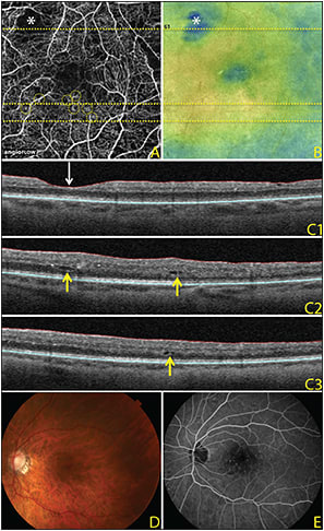 Figure 1. OCTA images, 3 mm x 3 mm, of a diabetic eye. The horizontal lines across the OCT angiogram (A) and OCT retinal map (B) represent the locations of the three corresponding OCT B scans (C). The OCT angiogram demonstrates an area of capillary nonperfusion (asterisk) that corresponds to thinning on the OCT retinal map and corresponding OCT B scan (C1; white downward-facing arrow). Microaneurysms (yellow circles) on the OCT angiogram are adjacent to intraretinal cysts, as seen on the corresponding OCT B scans (C2-3; yellow upward-facing arrows) and correspond to thickening on the OCT retinal map. Color fundus photograph (D) and fluorescein angiography (E) of the same eye.