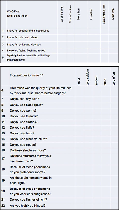 Patients can record their perceived personal and individual types of floater patterns on paper or using a scanner (Figure 1, next page). Effects on patient quality of life, visual quality, general well-being, and the character of vision disorders can be recorded pre- and postoperatively with the NEI-VFQ-25 questionnaire4-10 and with a Frankfurt floater questionnaire (FFQ-22), based on the Wellbeing Index (WHO-5) and the customized floater questionnaire (FFQ-17) — which we call the FFQ-22 (Figure 2).11