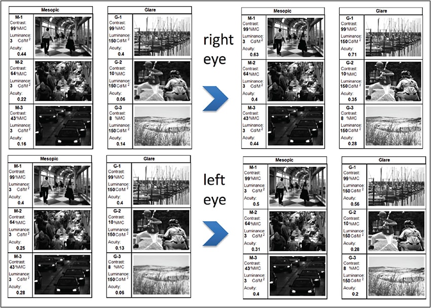 After surgery, eventual improvement occurred in VA (Sloan letters) and, most importantly, in CVA values under mesopic and glare conditions of different degrees (in both eyes, pre- to postoperatively).