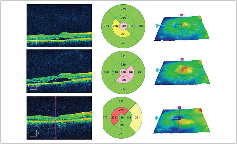 Figure 2. This patient presented with subfoveal fluid in the right eye due to nAMD (top row). The fluid failed to respond to two injections of bevacizumab, so treatment was switched to monthly aflibercept. The fluid initially resolved but then worsened despite continued monthly injections (middle row). Treatment with aflibercept and bevacizumab (alternating every two weeks) resulted in complete resolution of the fluid after three months (bottom row).