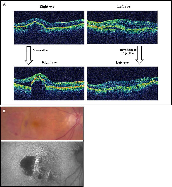 Figure 3. A) This patient with newly diagnosed nAMD presented with a larger fibrovascular PED OD but more intraretinal fluid OS (top). An injection of bevacizumab improved edema in the left eye, but a RPE tear developed in the untreated right eye (bottom). B) Color photography (top) and fundus autofluorescence (bottom) show the RPE tear. Both eyes subsequently received bevacizumab injections for three years with maintenance of 20/40 VA OD despite mild persistent subretinal fluid but with the development of a disciform scar and 20/100 VA OS. This case shows that aggressive anti-VEGF treatment can maintain good VA in eyes with RPE tears.