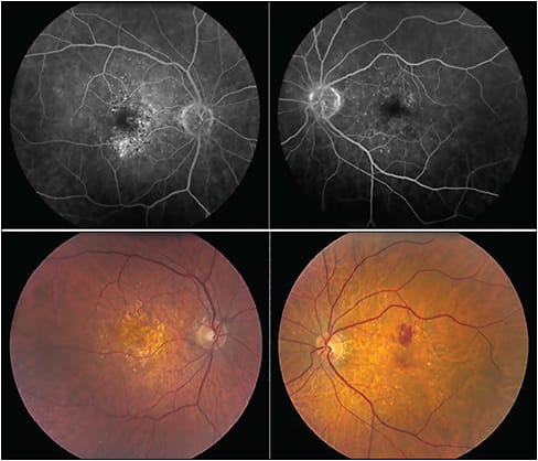 Figure 1. The fluorescein angiogram images (top row) show newly diagnosed occult CNV OD and drusen OS. The right eye received monthly injections of aflibercept, and one year later, the left eye developed occult CNV. Over a period of 48 months, the patient received 28 injections of aflibercept OD and 11 injections of ranibizumab OS. Significant GA developed in the right eye (most of it in the area of the original CNV), but no GA developed in the left eye (bottom row). This case highlights the difficulty in determining the etiology of RPE atrophy as the affected right eye received significantly more anti-VEGF injections but most of the GA occurred in the area of the previous CNV.