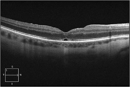 Figure 5. Almost one year following PPV, the FTMH remained closed with mild attenuation of the subfoveal ellipsoid zone, and the vision remained stable.