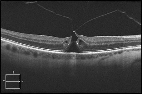 Figure 1. An eye from the series at the New England Eye Center, with FTMH measuring 216 µm and concurrent focal VMT; this patient’s best-corrected Snellen visual acuity was 20/70.