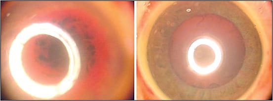 Figure 1. Iris neovascularization limiting dilation and view in a premature baby; right image is one week after bevacizumab injection.