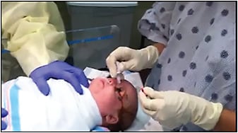 Figure 2. Preparation of the eye with a speculum and povidone-iodine in the NICU for intravitreal bevacizumab injection.