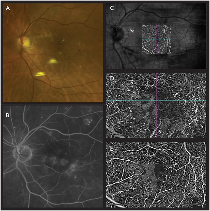 Figure 1D shows an OCT of the macula showing significant intraretinal and subretinal fluid. Figure 1E shows an OCT angiogram of the superficial plexus indicating areas of ischemia, as seen by the lack of flow in the occluded area. The initial formation of anastomoses can be identified temporally.
