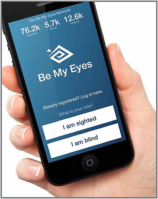 Using this app (pictured), individuals who are blind, visually impaired, or have low vision can request a video connection with a sighted volunteer for help. For example, if the user can’t read the instructions on a package, she connects with a volunteer on the phone or tablet, points the device at the package, and asks the volunteer to read it aloud.
