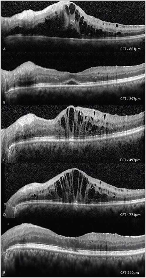 Figure 1. A 60-year-old male patient with CRVO in the left eye (A), who previously received three injections of IVB, showed initial response (B) but later demonstrated recurrence (C) and worsening after a third dose of IVB (D) Subsequently, cytokine levels were analyzed (VEGF, IL-6, IL-8 levels of 29.94, 1.31, 82.12 pg/mL, respectively); correspondingly, IVTA was administered with complete resolution of ME and no recurrenceatn two consecutive monthly follow-ups. CFT – Central foveal thickness, IVB – Intravitreal bevacizumab, IVTA – Intravitreal triamcinolone acetonide.