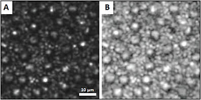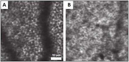 Figure 5. Confocal AOSLO images of the human photoreceptor mosaic, displayed in linear scale (A) and logarithmic scale (B). Smaller cells are rods, and larger cells are cones.7