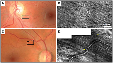 Figure 11. Fundus photographs of a healthy control (A) and a glaucoma patient (C), with black boxes indicating the RNFL area imaged with confocal AOSLO in (B) and (D). (B) reflects a healthy RNFL, whereas the hypofluorescent region demarcated by yellow arrows in (D) reflects an RNFL defect.