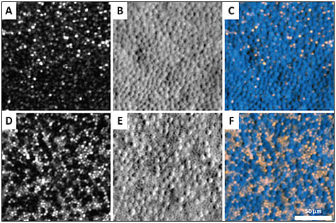Figure 4. Photoreceptor mosaic at two different retinal eccentricities in a patient with achromatopsia imaged by AOSLO. (A and D) Confocal images; (B and E) Nonconfocal (split-detector) images; and (C and F) color-merged images, where the confocal image is displayed in orange, and nonconfocal image is shown in blue. The inner segments in the nonconfocal images correspond to the dark, nonreflective cones in the confocal images, reflecting intact cone structure that cannot be visualized using confocal AOSLO.6