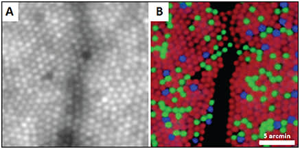 Figure 2. (A) Foveal cone photoreceptor mosaic imaged with an adaptive optics fundus camera and (B) pseudocolor image of the same location with blue, green, and red representing the S, M, and L cones, respectively. Shadows are from overlying blood vessel.2