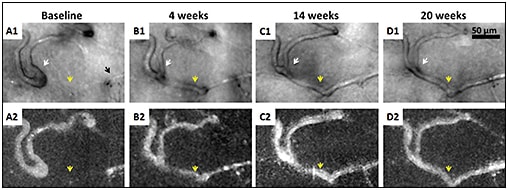 Figure 10. Nonconfocal AOSLO (offset pinhole) structural images (A1-D1) and perfusion maps (A2-D2) of a patient with proliferative diabetic retinopathy. Black arrow indicates a capillary segment with an abrupt end (A1). White arrows indicate that as the neighboring capillary is recanalized and reperfused (yellow arrows), vessel caliber and distortion decrease.15