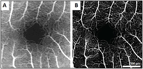 Pinhas et al demonstrated a decrease in vessel density in fellow eyes of patients with nonischemic central retinal vein occlusions (Figure 9).14 These findings may serve as biomarkers for the identification of microvascular disease before the onset of clinical deterioration.