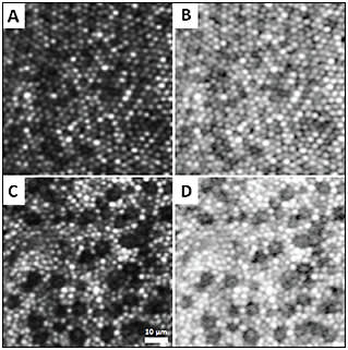 The development of the first adaptive optics scanning laser ophthalmoscope (AOSLO) greatly enhanced image quality through the use of a confocal pinhole to eliminate out-of-focus light.4 Because reflectance is an indication of cellular integrity, dark gaps produced by non-wave-guiding cones within the photoreceptor mosaic can be used to identify cellular damage. Such abnormalities are commonly discernible in pathological conditions, such as cone rod dystrophies (Figure 3).