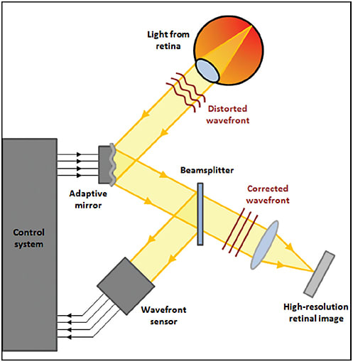 Adaptive optics was introduced in astronomical telescopes to compensate for atmospheric turbulence, thereby removing the “twinkling” of starlight to help to resolve celestial objects. The mechanism involves a sensor that detects and measures the wavefront distortions of the light entering the system, transmitting these details to a deformable mirror via a control loop. The deformable mirror inverts the aberrations, correcting the distortions in the wavefront.