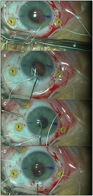 Figure 5. When managing suture ends, it is helpful to place either the two nasal or two temporal ends of the Gore-Tex suture into the anterior chamber and externalize them through their sclerotomy sites first before placing the intraocular lens (IOL) into the anterior chamber (A). This minimizes the number of free suture ends within the eye after placement of the IOL. After the IOL has been displaced posteriorly into the ciliary sulcus (B), the remaining two sutures can then be passed into the eye and externalized through their respective sclerotomies (C and D).