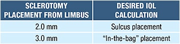 For this reason, most surgeons at our institution have adjusted their sclerotomy placement to 3.0 mm posterior to the limbus. Accordingly, the desired IOL power becomes equivalent to an “in-the-bag” placement of the lens. If the surgeon elects to create sclerotomies 2.0 mm from the limbus, the IOL calculation should then be adjusted for a sulcus-placed lens (Figure 4).