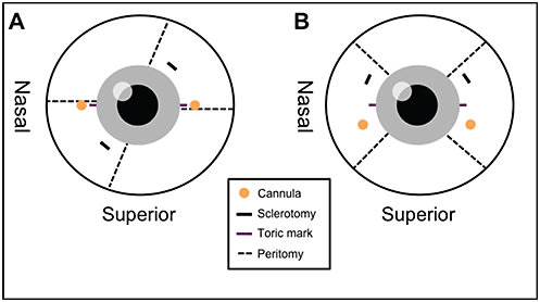 In situations in which the cataract surgeon created a superior corneal incision, a superior approach in which the four sclerotomies straddle the horizontal meridian (2 mm superior and inferior to the toric markings) with the cannulas housed in the superior sclerotomies may be preferred (Figure 3B).