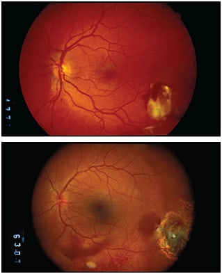 Figure 1. Top) Image of an intraretinal glass IOFB, with pre-operative VA of 20/40. The removal process involved a PPV, freeing of the encapsulated intraretinal glass IOFB, removal by forceps, and placement of endophotocoagulation around the margins of the IOFB removal site. Bottom) Postoperative image, showing removal of the IOFB, with laser demarcation around the previous retinal IOFB site. VA stabilized at 20/20.