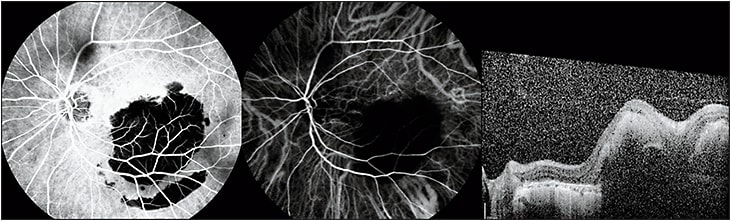 Figure 3. Fluorescein angiography (left), indocyanine green angiography (middle), and optical coherence tomography (right) of the same subject from Figures 1 and 2 after failed treatment extension to a 12-week interval. Substantial subretinal hemorrhaging is evident, and the Snellen visual acuity dropped to 20/200. The pronounced enlargement (>50%) in choroidal neovascularization surface area on indocyanine green angiography from the eight- to 10-week follow-up interval portended this treatment extension failure.