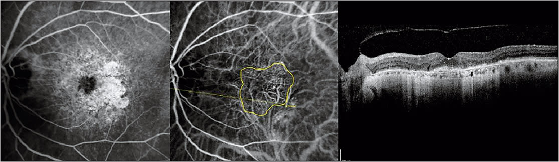 Figure 1. Fluorescein angiography (left), indocyanine green angiography (middle), and optical coherence tomography (right) of a 77-year-old woman with neovascular age-related macular degeneration undergoing bevacizumab therapy using a treat-and-extend protocol. The patient was imaged during the follow-up examination following a successful treatment extension to an eight-week interval. Her Snellen visual acuity was 20/30. Notice the absence of retinal fluid on optical coherence tomography. The choroidal neovascularization is encircled in yellow on indocyanine green angiography and measures 5.79 mm2. Prominent geographic atrophy is evident by fluorescein angiography and optical coherence tomography, but the choroidal neovascularization is indistinct on these systems. The patient was treated with bevacizumab during this follow-up and extended out to a 10-week interval.