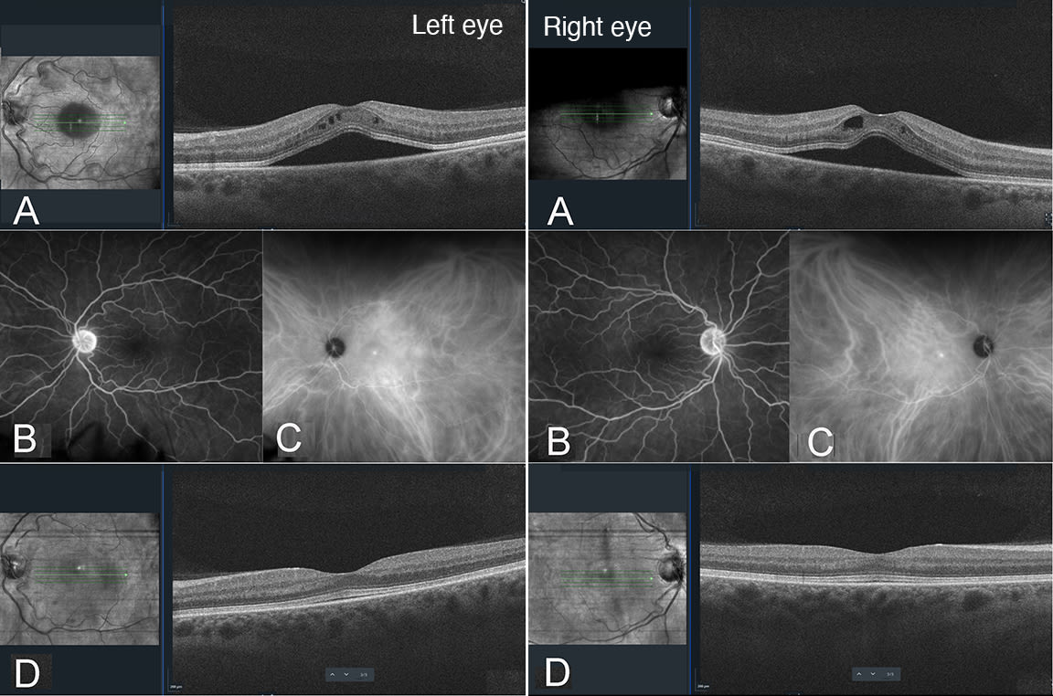 Figure 1. Bilateral central serous chorioretinopathy that developed in a 44-year-old woman after 3 doses of binimetinib, a MEK inhibitor, for metastatic melanoma. Optical coherence tomography (OCT) was notable for subretinal fluid with overlying intraretinal cysts in both eyes (A) that essentially resolved after 1 month without any change in therapy. Initial fluorescein angiography (FA) was without any leakage (B), and indocyanine green (ICG) angiography demonstrated a focal area of hypercyanescence in the macula bilaterally (C). The subretinal fluid resolved after 1 month without any change in therapy (D). Image courtesy Saam Mojtahed, MD