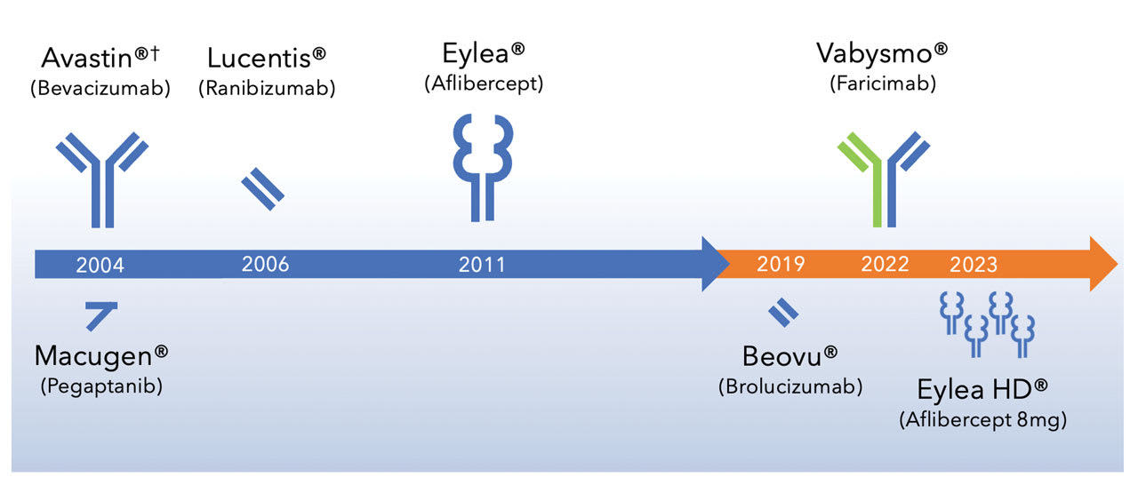 The modern anti-VEGF era (Figure 1) began with the approval of ranibizumab 0.5 mg (Lucentis; Genentech) for nAMD in 2006. Around the same time, bevacizumab (Avastin; Genentech), initially approved for cancer treatment, was used off-label for nAMD due to its similar mechanism of action and significantly lower cost. Another early anti-VEGF treatment, pegaptanib sodium injection (Macugen; OSI Eyetech Pharmaceuticals/Pfizer), was approved in 2004. Although Macugen targeted VEGF165 specifically, it was eventually overshadowed by the more potent anti-VEGF therapies that followed. (Macugen is no longer available in the United States.)