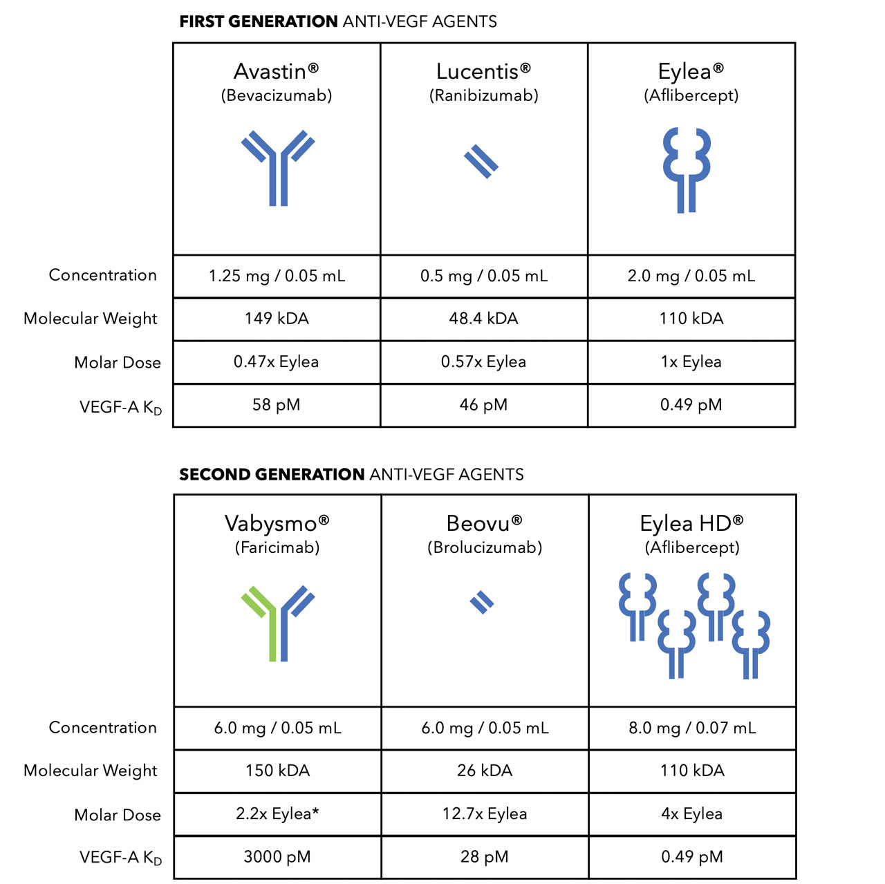 * Vabysmo is a bispecific antibody with binding sites for VEGF-A and Ang-2. Although the molar dose of Vabysmo is 2.2 times the molar dose of Eylea, the effective molar dose is 1.1 times, because only half of its binding capacity is dedicated to VEGF-A.