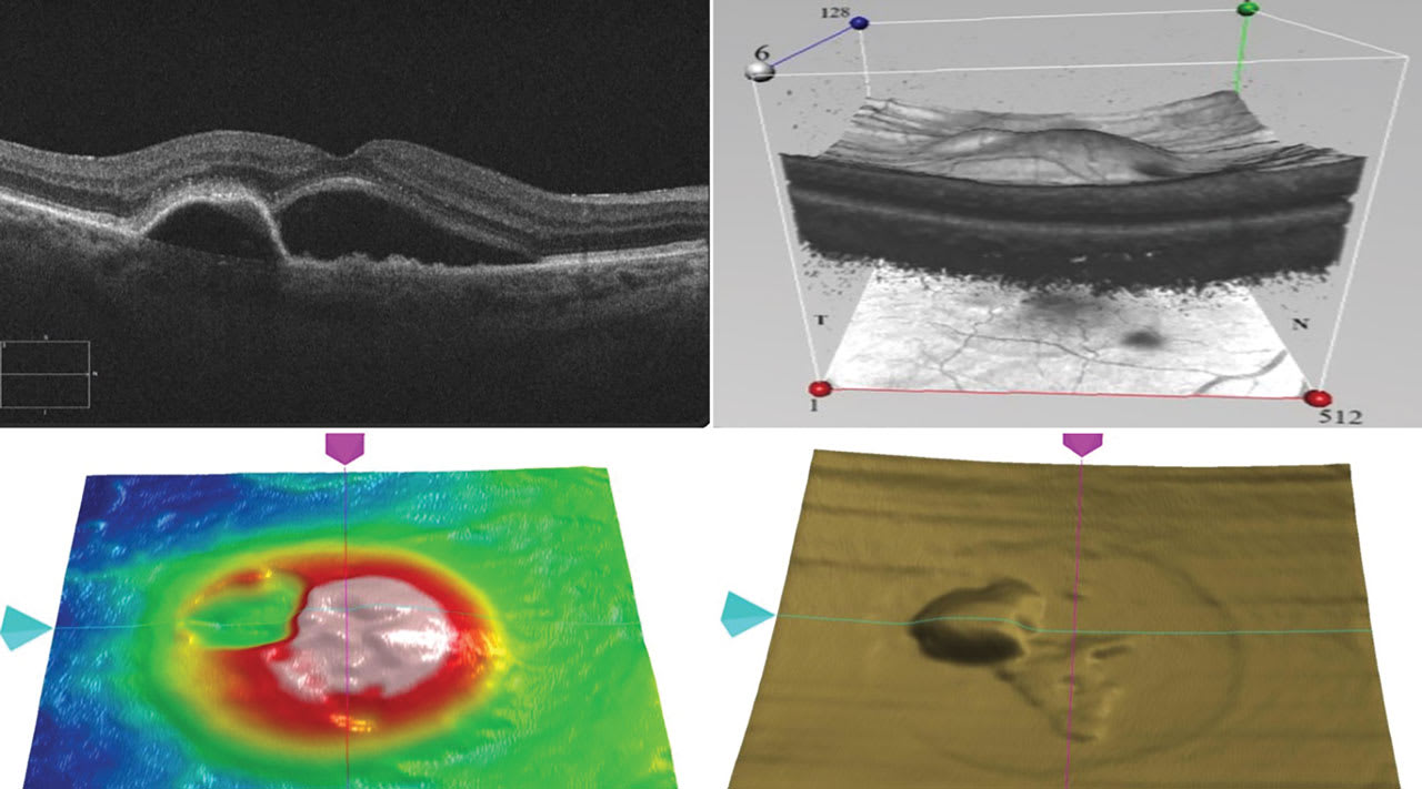 Figure 1. Multiple optical coherence tomography (OCT) images from a single case of neovascular age-related macular degeneration. Clockwise from upper left: subfoveal choroidal neovascularization associated with subretinal fluid and serous pigment epithelial detachment (PED) with a solid component at its anterior border; an image from the “cube” capture of the case, allowing for 3-dimensional analysis of the pathologic anatomy overlying the en face image; the OCT “RPE slab” image showing the PED in relief; the “ILM-RPE” analysis highlights the regions where the fluid is most significant. Image courtesy Michael Colucciello, MD, FASRS.