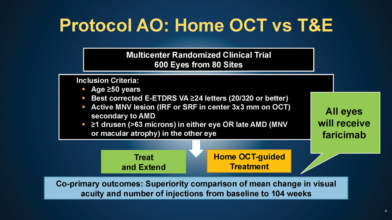 In May 2024, the US Food and Drug Administration granted de novo marketing authorization for Notal Vision’s Scanly home optical coherence tomography (OCT) imaging device, which enables physicians to monitor progression of neovascular (“wet”) age-related macular degeneration (nAMD) between office visits. Currently, the DRCR Retina Network is conducting Protocol AO (NCT05904028), a study that will compare nAMD treatment guided by home OCT with a more traditional treat-and-extend (T&E) approach (Figure 1, 2, 3, 4). The primary objective of Protocol AO is to determine whether home OCT guidance results in better visual acuity outcomes and/or a lower number of injections over 104 weeks, compared to T&E.