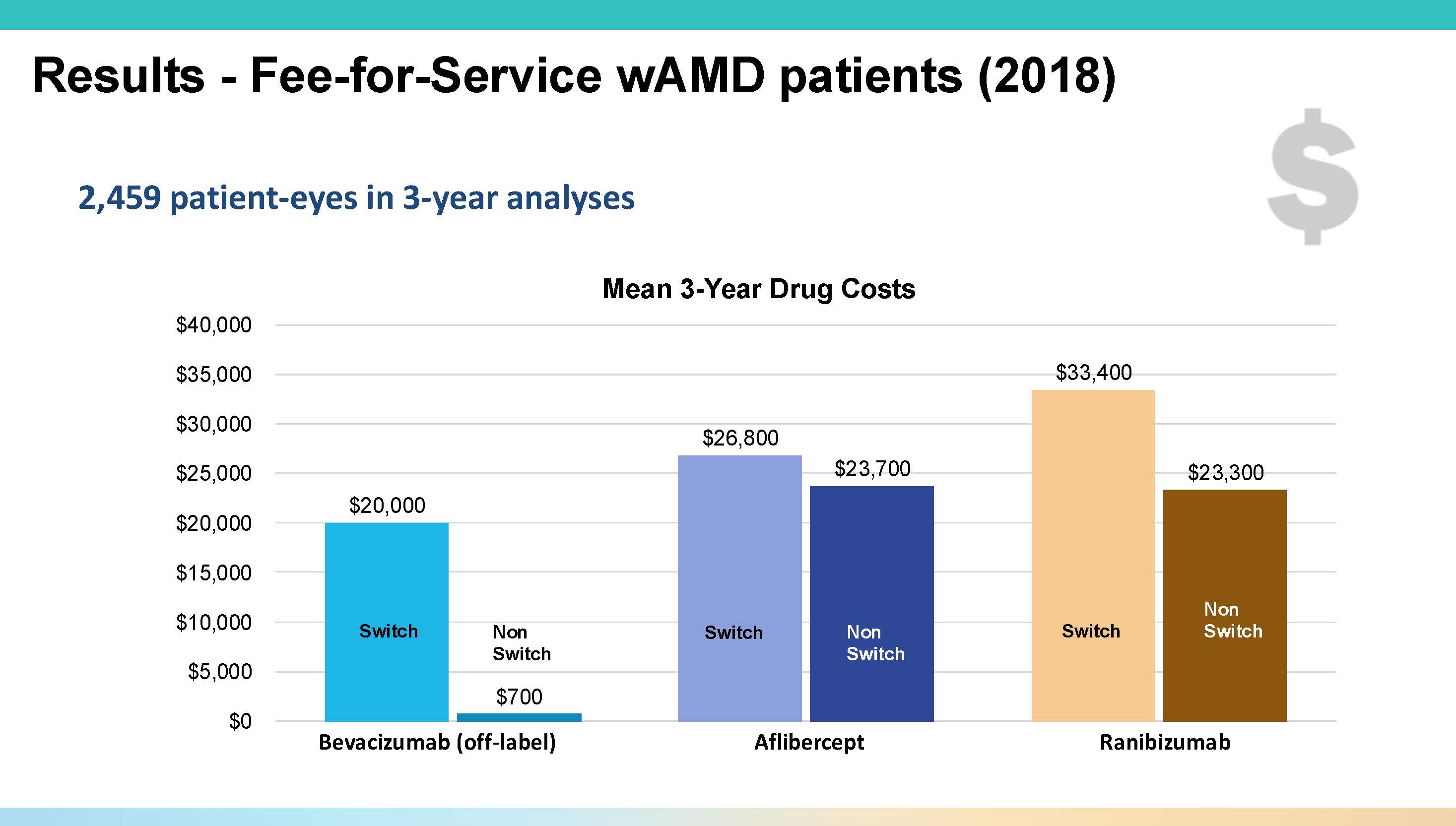 Figure 2. The 3-year average cost of treating with bevacizumab is around $700, compared to roughly $20,000 after switching to another anti-VEGF agent.