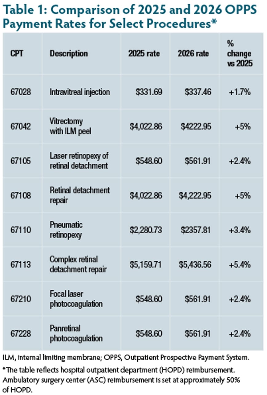 In late November, the Centers for Medicare and Medicaid Services (CMS) released its final 2026 rule for hospital outpatient departments (HOPDs) and ambulatory surgery centers (ASCs), setting a 3.3% overall increase to payment rates under the Outpatient Prospective Payment System (OPPS). The final rule maintains CMS’s use of Ambulatory Payment Classifications (APCs) to reimburse groups of similar procedures, with intraocular procedures grouped into 6 levels (APC 5491 to APC 5496).